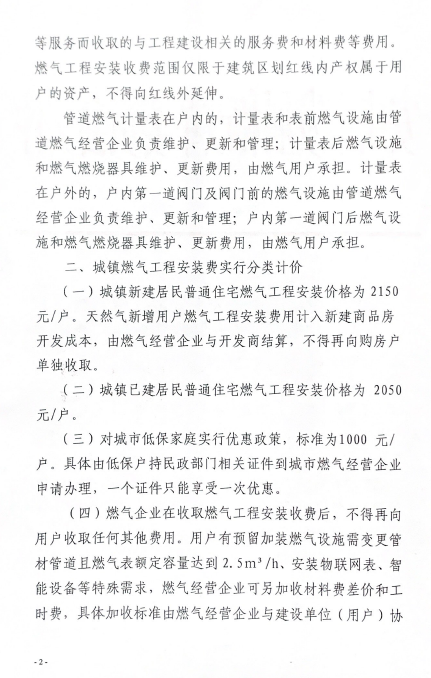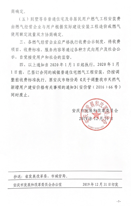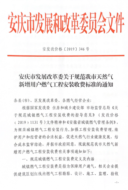 安慶市發(fā)展改革委關(guān)于規(guī)范我市天然氣新增用戶燃?xì)夤こ贪惭b收費(fèi)標(biāo)準(zhǔn)的通知(2019) 發(fā)布時(shí)間:2020-02-19    閱讀次數(shù):12912次