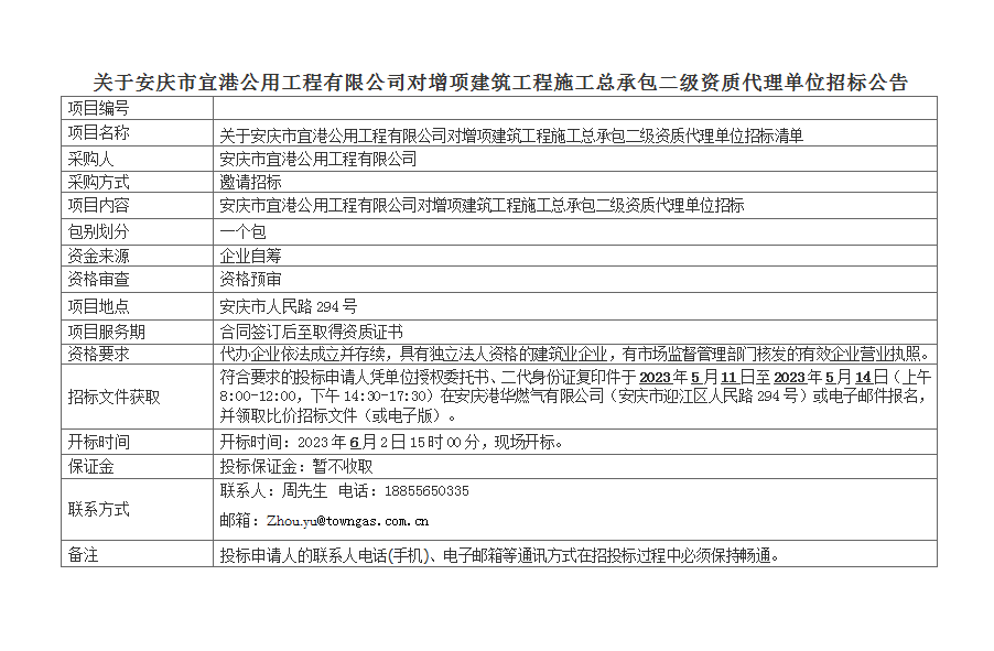 關于安慶市宜港公用工程有限公司對增項建筑工程施工總承包二級資質(zhì)代理單位招標公告
