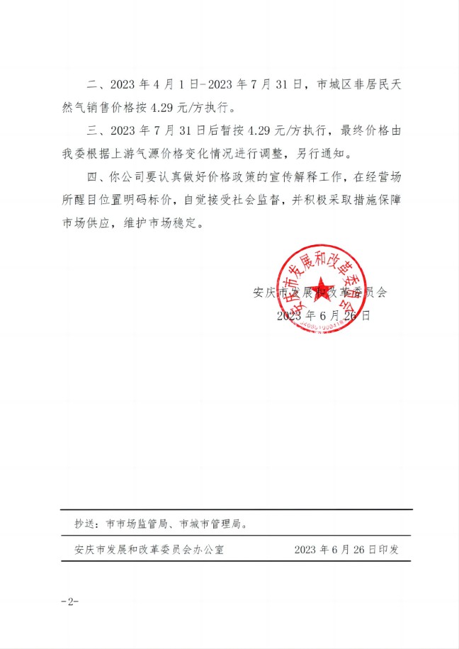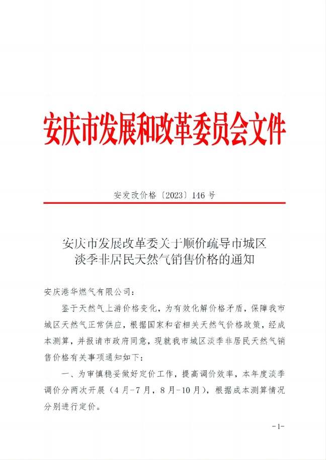 安慶市發(fā)展改革委關(guān)于順價(jià)疏導(dǎo)市城區(qū)淡季非居民天然氣銷售價(jià)(2023)格的通知
