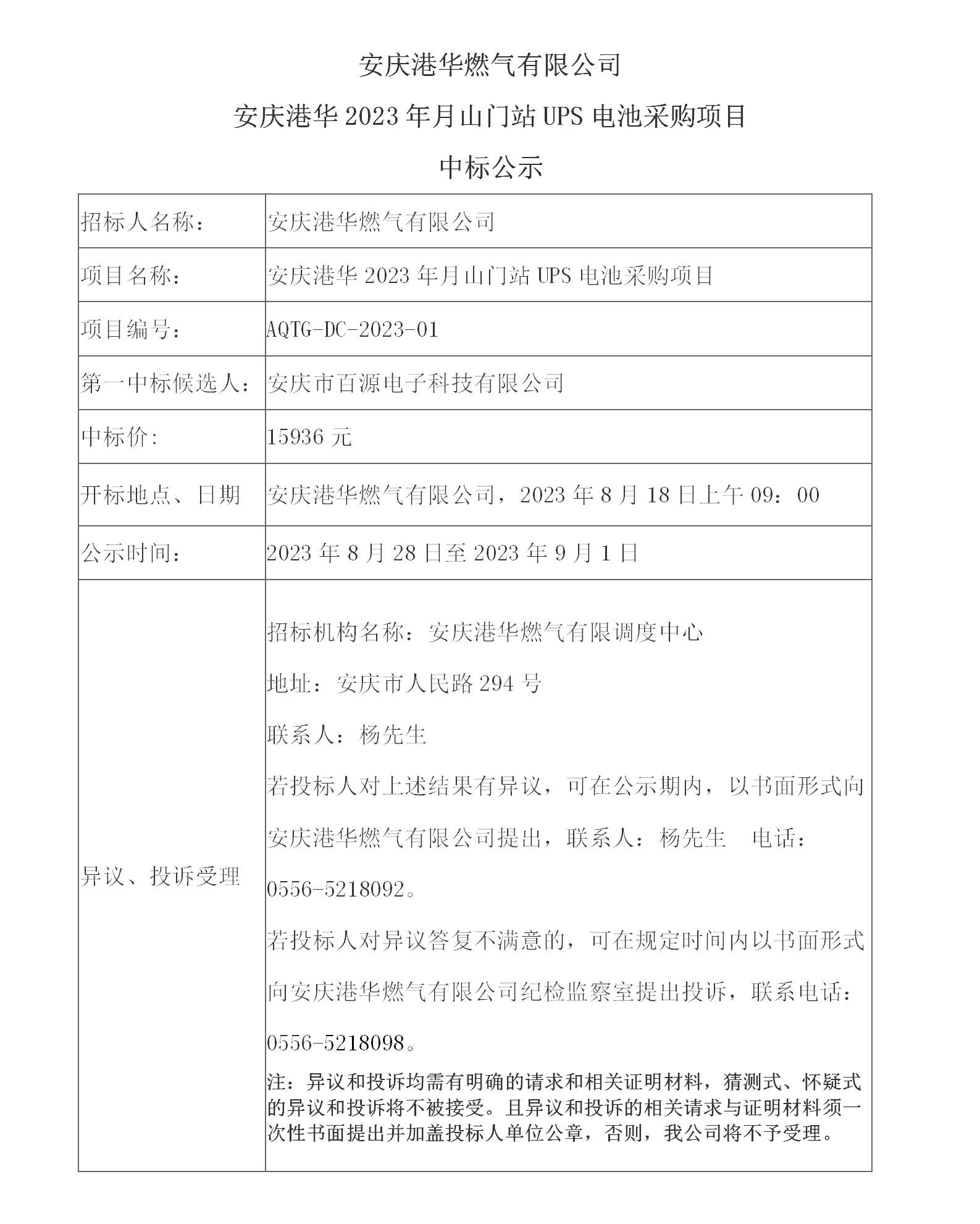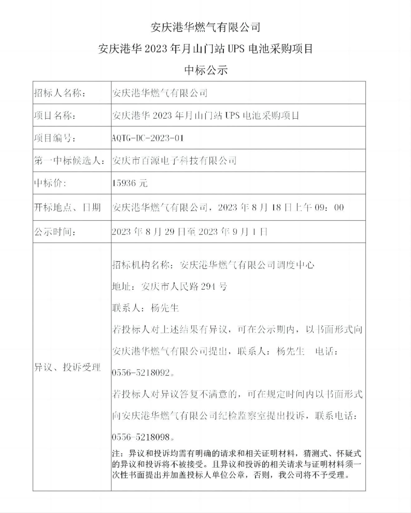 安慶港華燃?xì)庥邢薰?安慶港華2023年月山門站UPS電池采購(gòu)項(xiàng)目 中標(biāo)公示