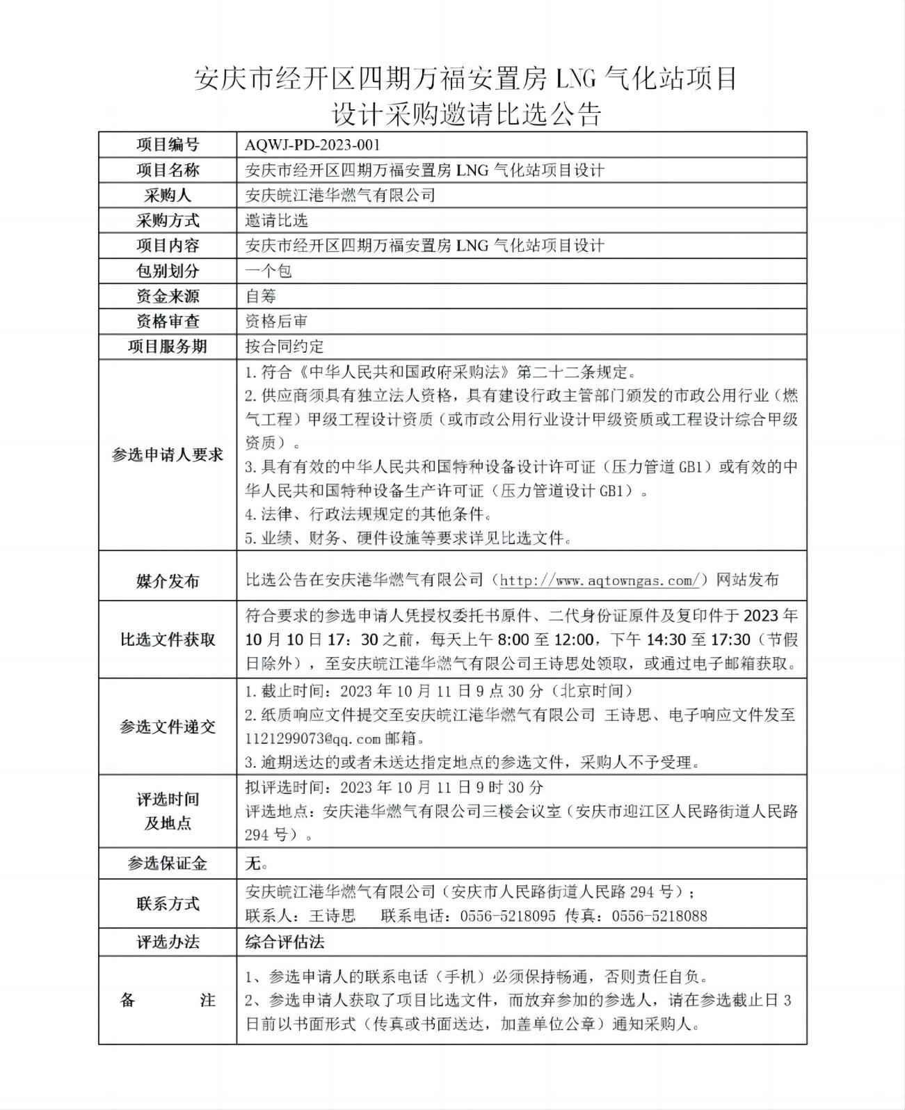 安慶市經(jīng)開區(qū)四期萬福安置房LNG氣化站項(xiàng)目 設(shè)計(jì)采購邀請(qǐng)比選公告 發(fā)布時(shí)間:2023-09-27    閱讀次數(shù):3377次