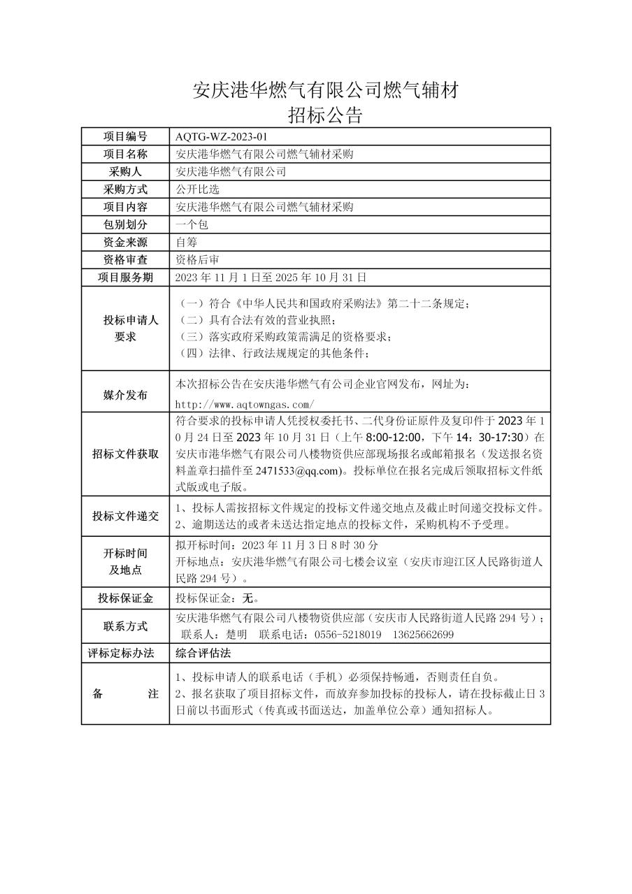 安慶港華燃氣有限公司燃氣輔材招標公告