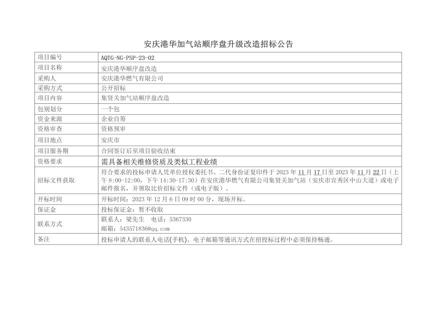 安慶港華加氣站順序盤(pán)改造項(xiàng)目招標(biāo)公告