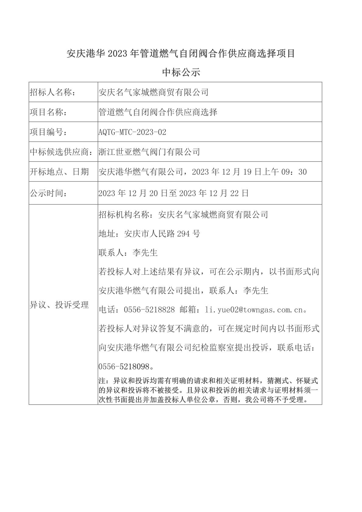 中標公示(安慶港華2023年管道燃氣自閉閥合作供應商選擇項目)