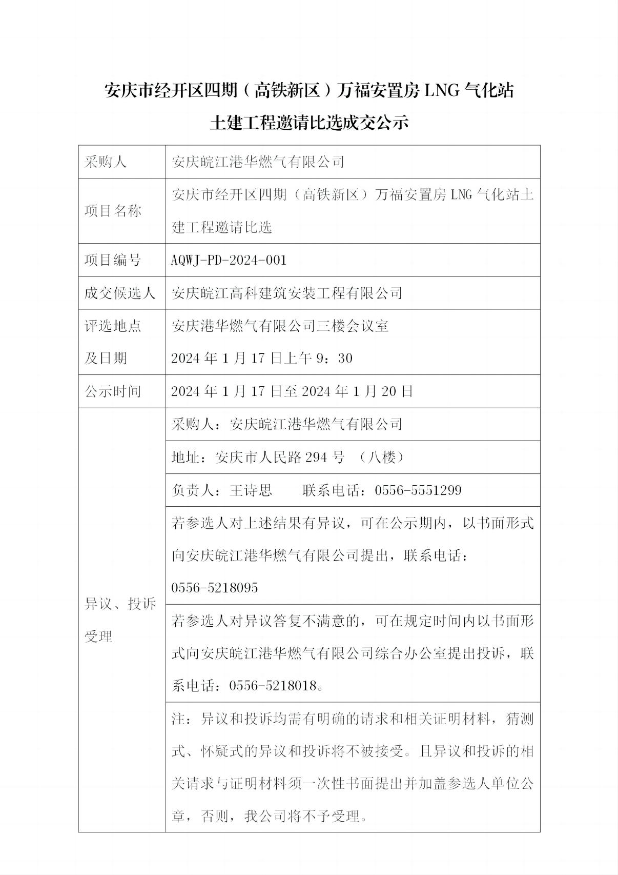 安慶市經(jīng)開區(qū)四期(高鐵新區(qū))萬福安置房LNG氣化站 土建工程邀請比選成交公示