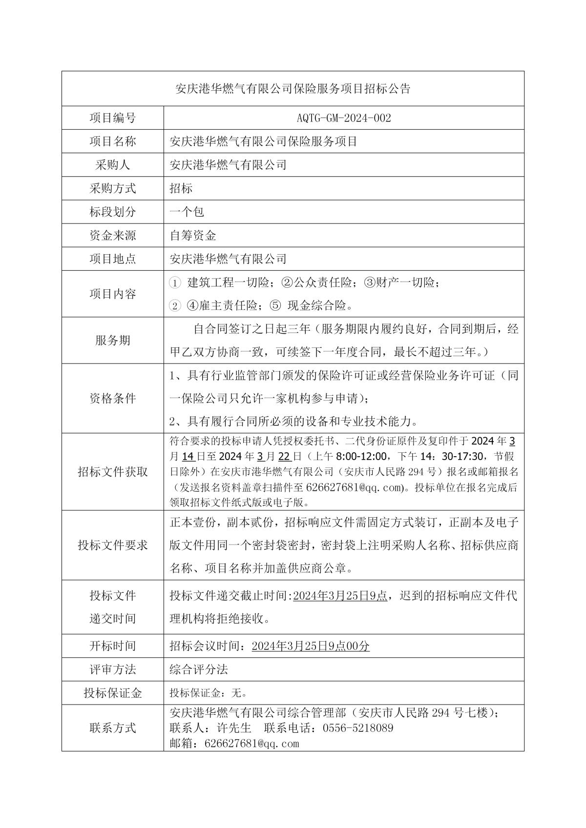 安慶港華燃?xì)庥邢薰颈kU(xiǎn)服務(wù)項(xiàng)目招標(biāo)公告