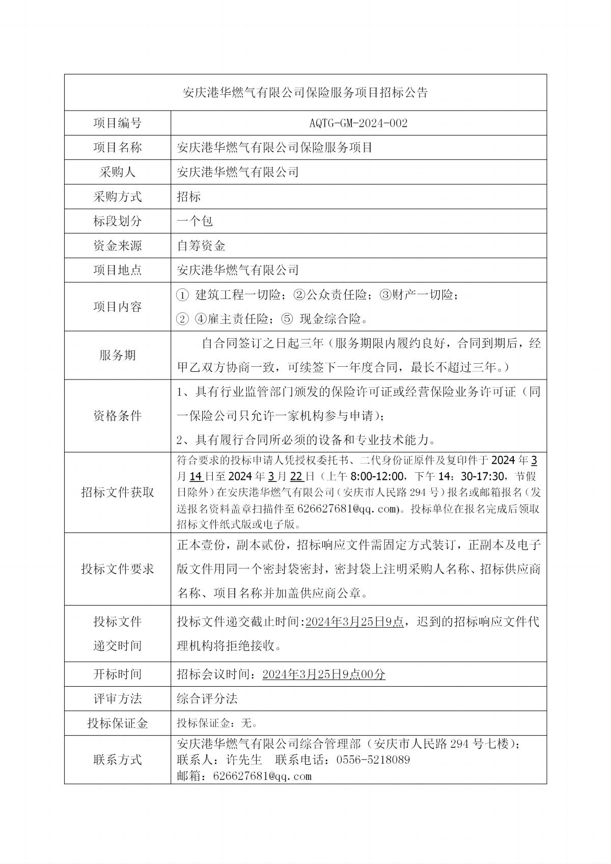 安慶港華燃氣有限公司車輛保險服務項目招標公告 發(fā)布時間:2024-03-22    閱讀次數(shù):3377次