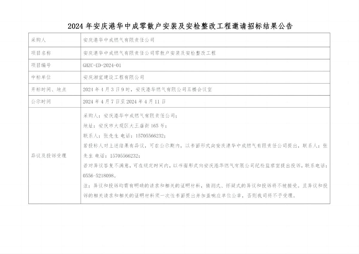 2024年安慶港華中成零散戶安裝及安檢整改工程邀請(qǐng)招標(biāo)結(jié)果公告