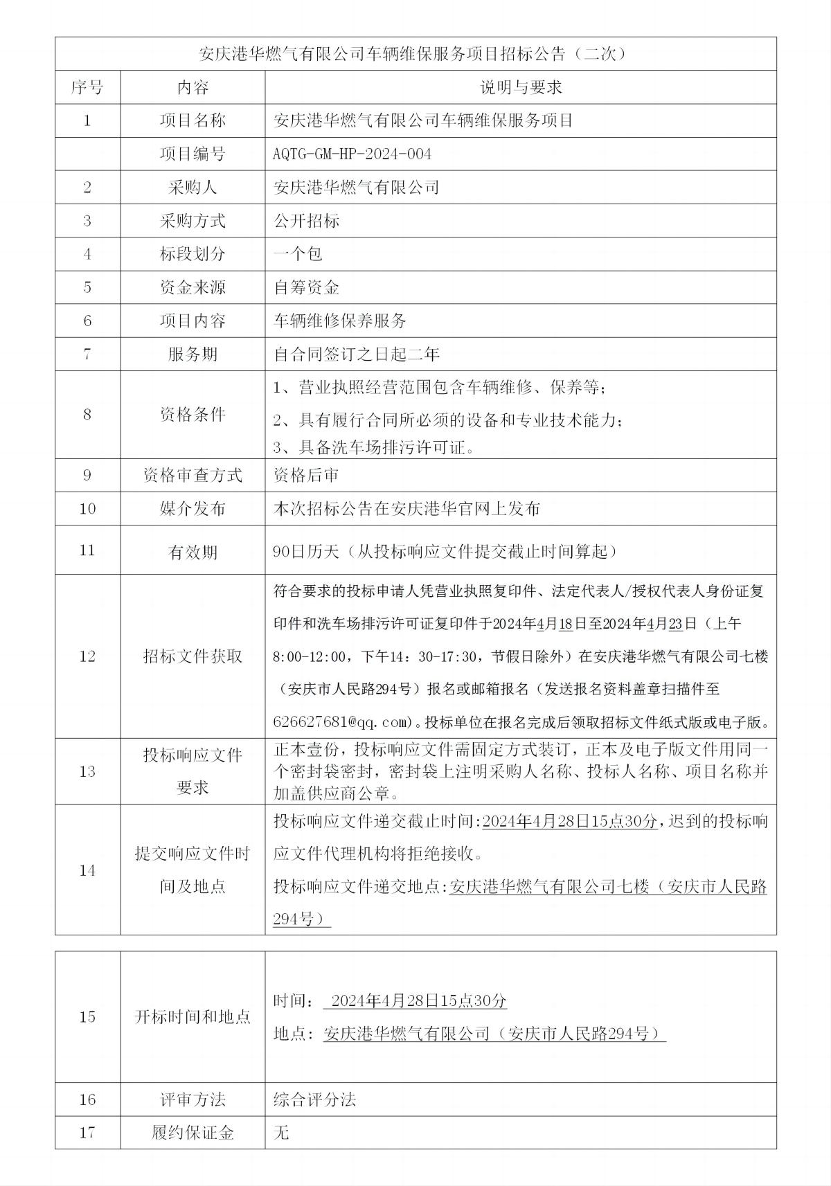安慶港華燃?xì)庥邢薰拒囕v維保服務(wù)項(xiàng)目招標(biāo)公告(二次) 發(fā)布時(shí)間:2024-04-18    閱讀次數(shù):3687次