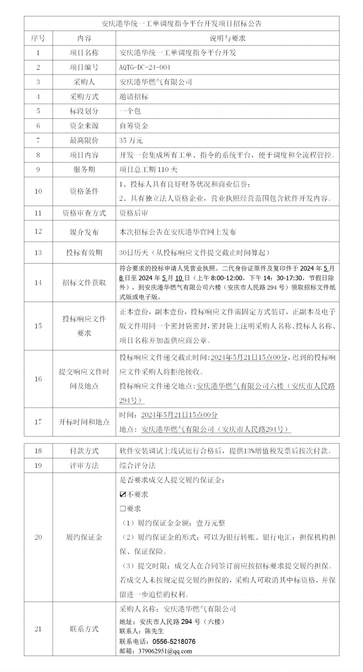 安慶港華統(tǒng)一工單調(diào)度指令平臺開發(fā)項(xiàng)目招標(biāo)公告