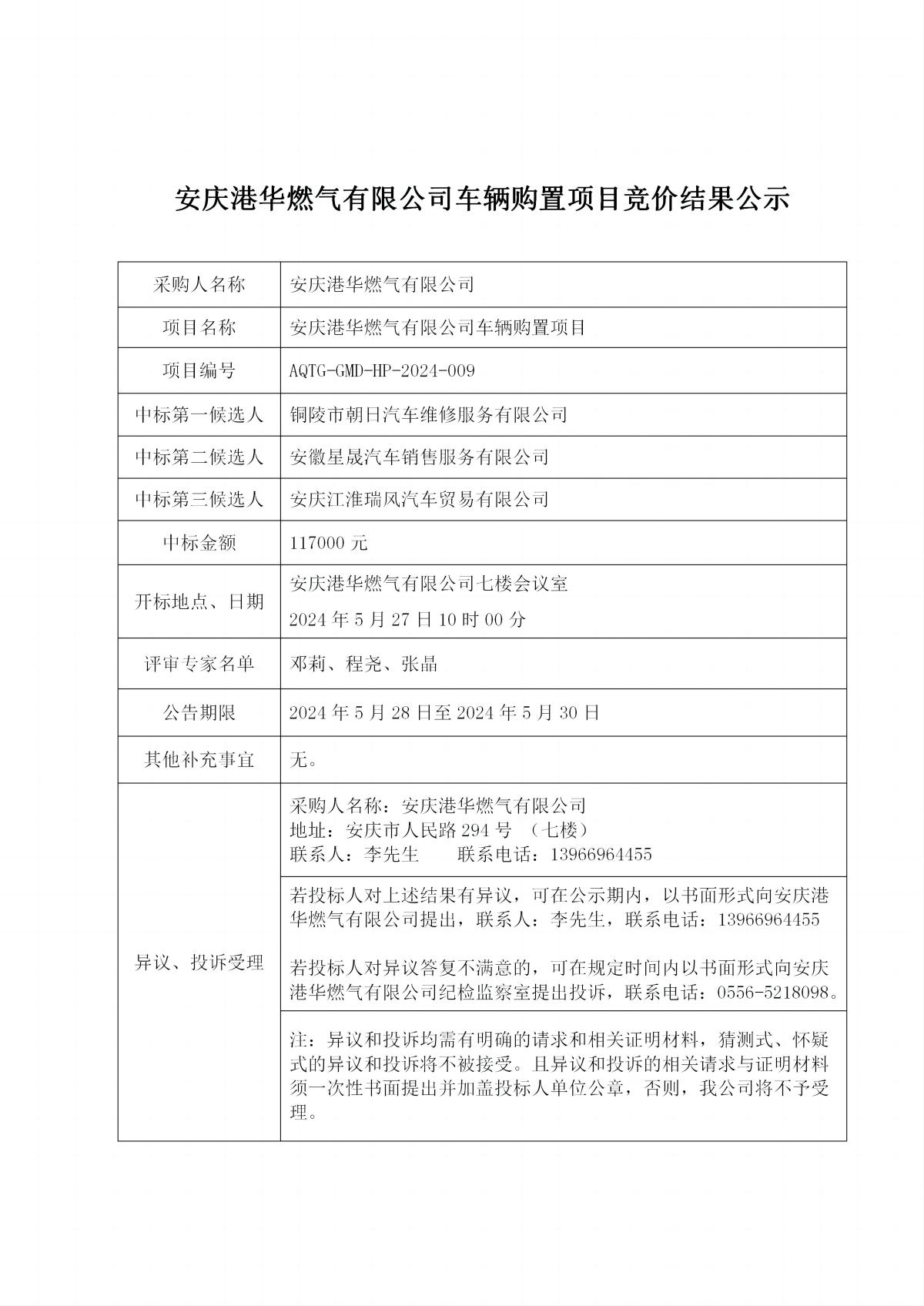 安慶港華燃氣有限公司車輛購置項目競價結(jié)果公示