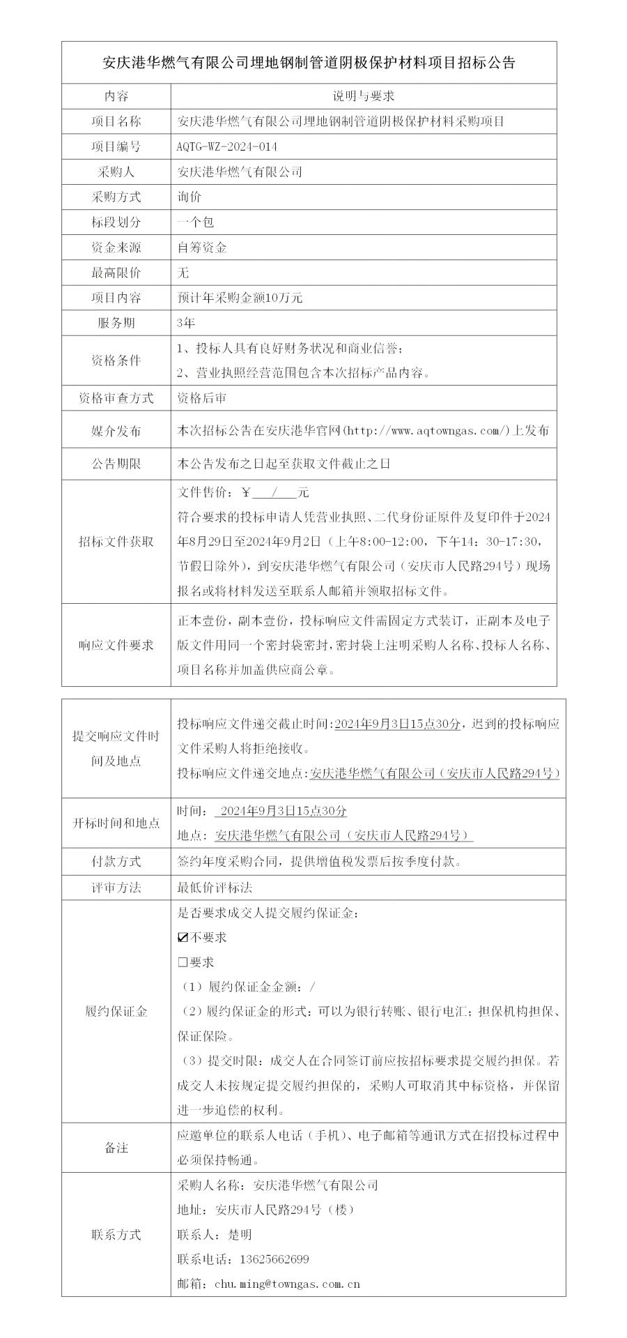 安慶港華燃?xì)庥邢薰韭竦劁撝乒艿狸帢O保護(hù)材料項目招標(biāo)公告