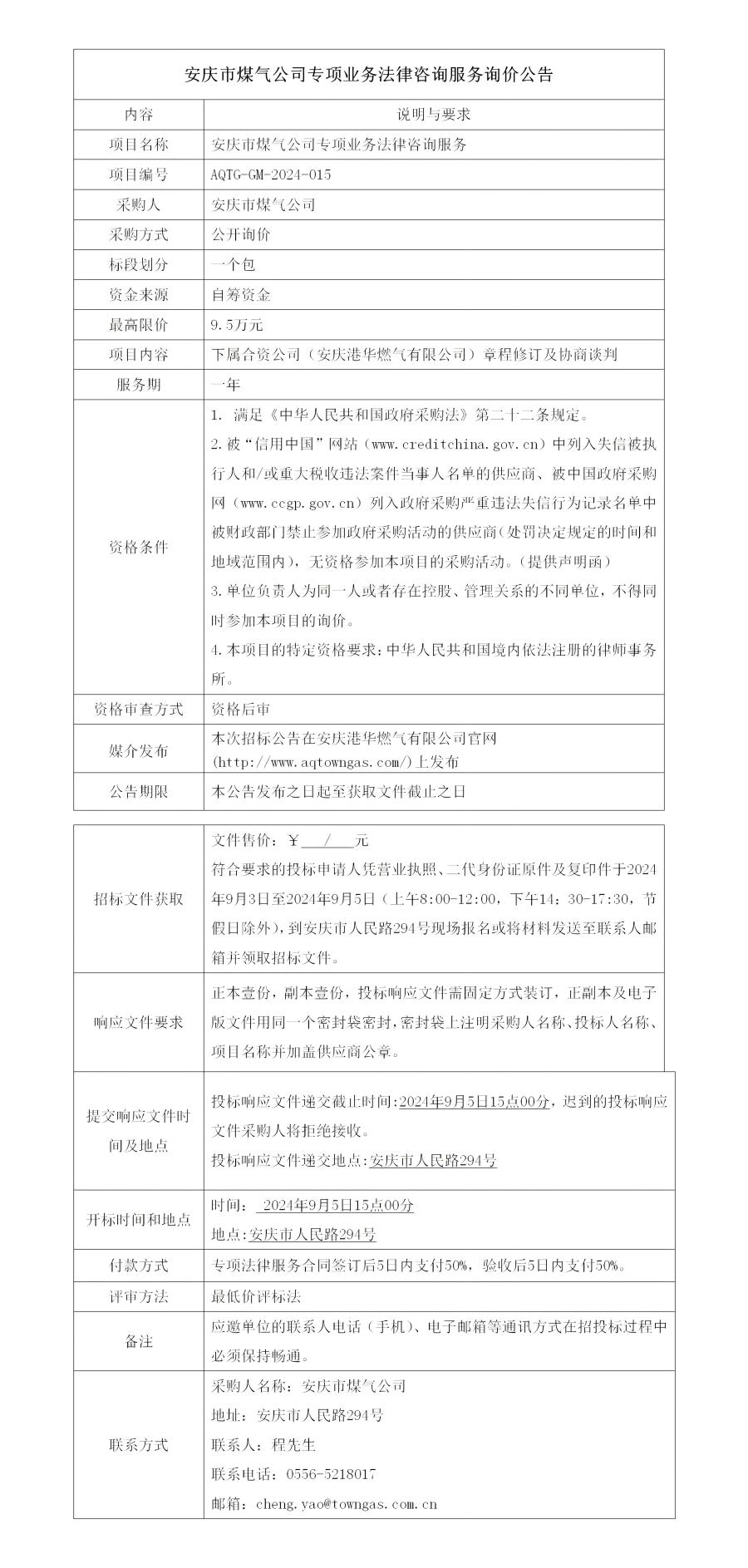 安慶市煤氣公司專項業(yè)務法律咨詢服務詢價公告