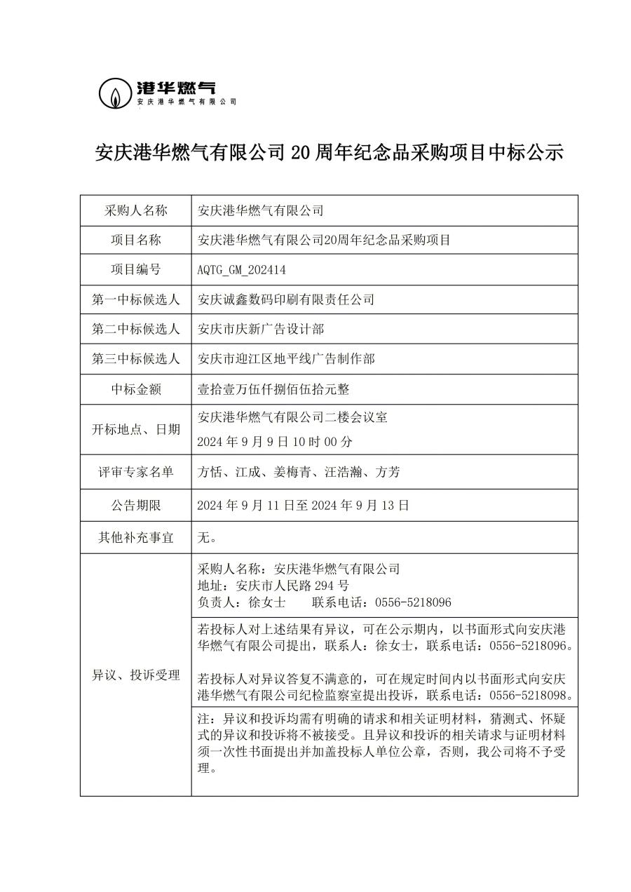 安慶港華燃氣有限公司 20 周年紀念品采購項目中標公示 發(fā)布時間:2024-09-11    閱讀次數(shù):2941次