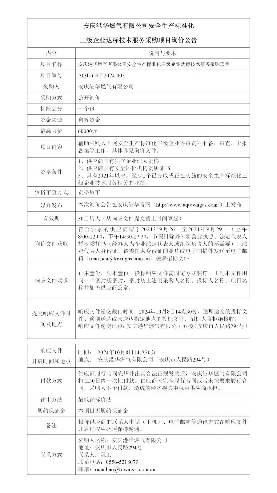 安慶港華燃?xì)庥邢薰景踩a(chǎn)標(biāo)準(zhǔn)化三級(jí)企業(yè)達(dá)標(biāo)技術(shù)服務(wù)采購(gòu)項(xiàng)目詢價(jià)公告