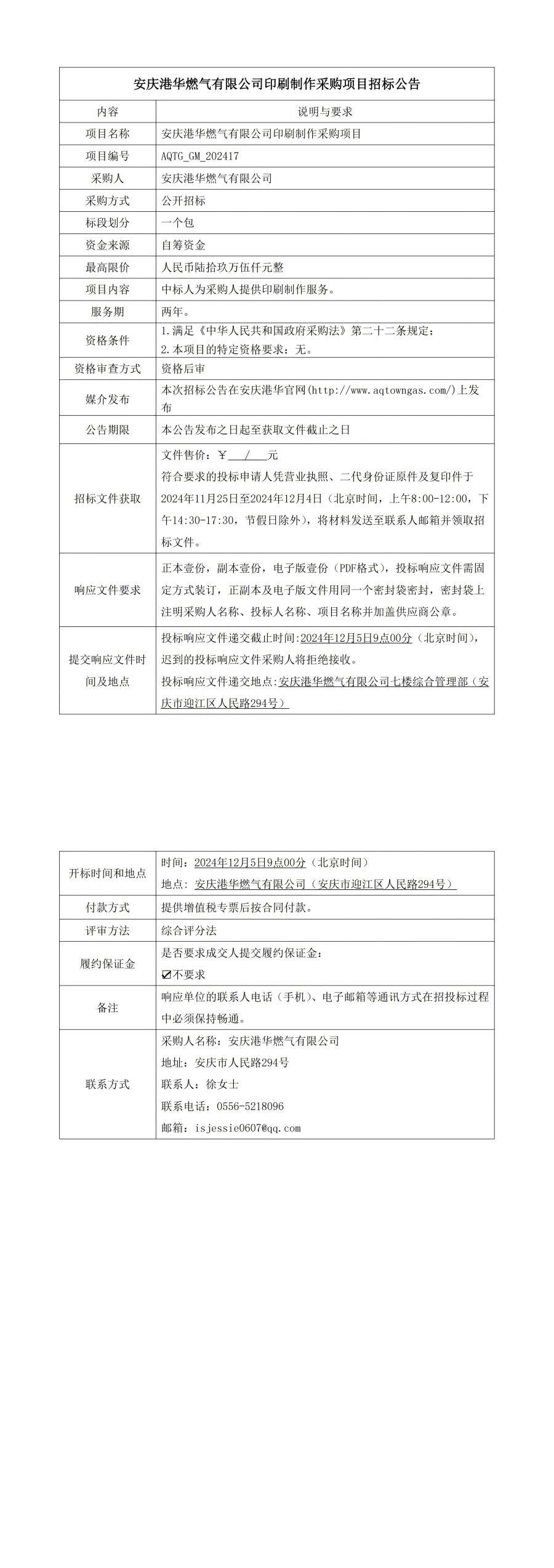 安慶港華燃氣有限公司印刷制作采購項目招標公告