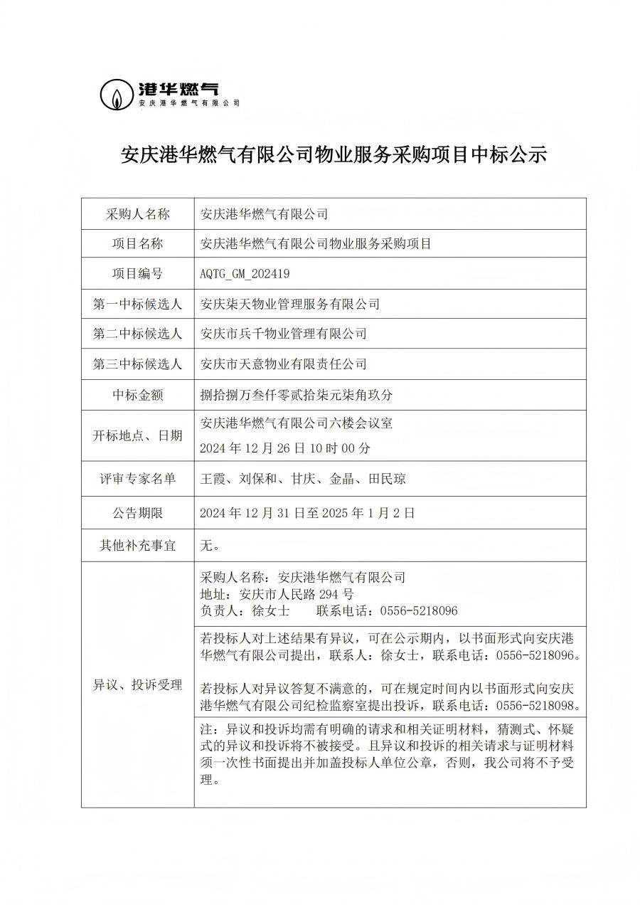 安慶港華燃?xì)庥邢薰疚飿I(yè)服務(wù)采購(gòu)項(xiàng)目中標(biāo)公示 發(fā)布時(shí)間:2024-12-31    閱讀次數(shù):2761次