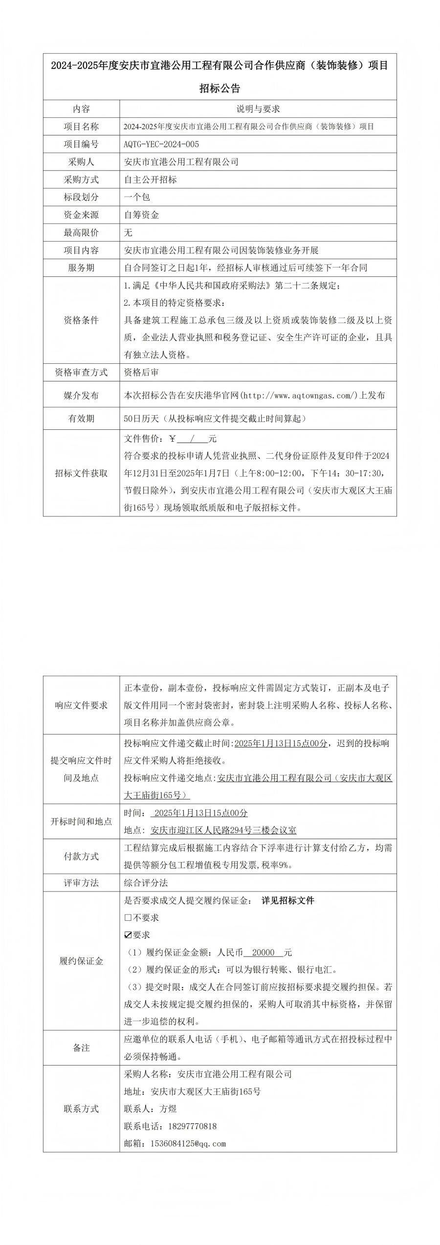 2024-2025年度安慶市宜港公用工程有限公司合作供應(yīng)商(裝飾裝修)項(xiàng)目 招標(biāo)公告 發(fā)布時(shí)間:2024-12-31    閱讀次數(shù):2737次