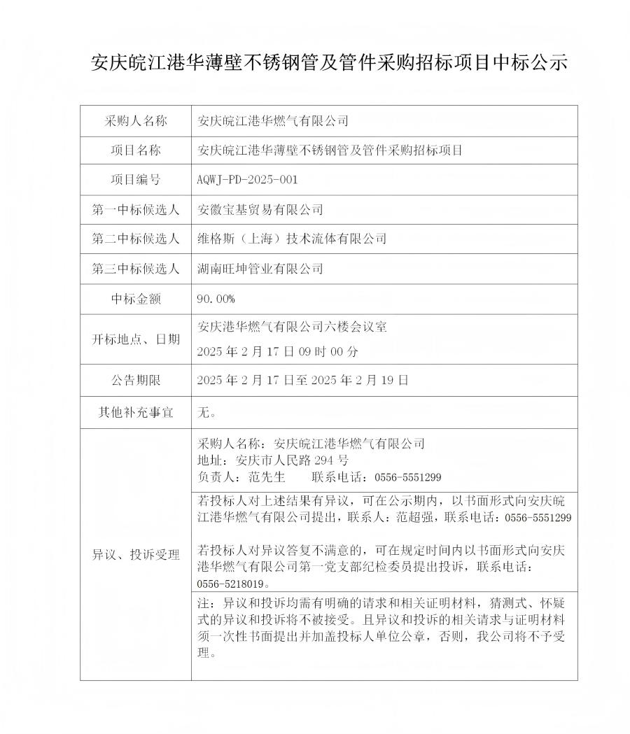 安慶皖江港華薄壁不銹鋼管及管件采購招標項目中標公示 發(fā)布時間:2025-02-17    閱讀次數(shù):2290次