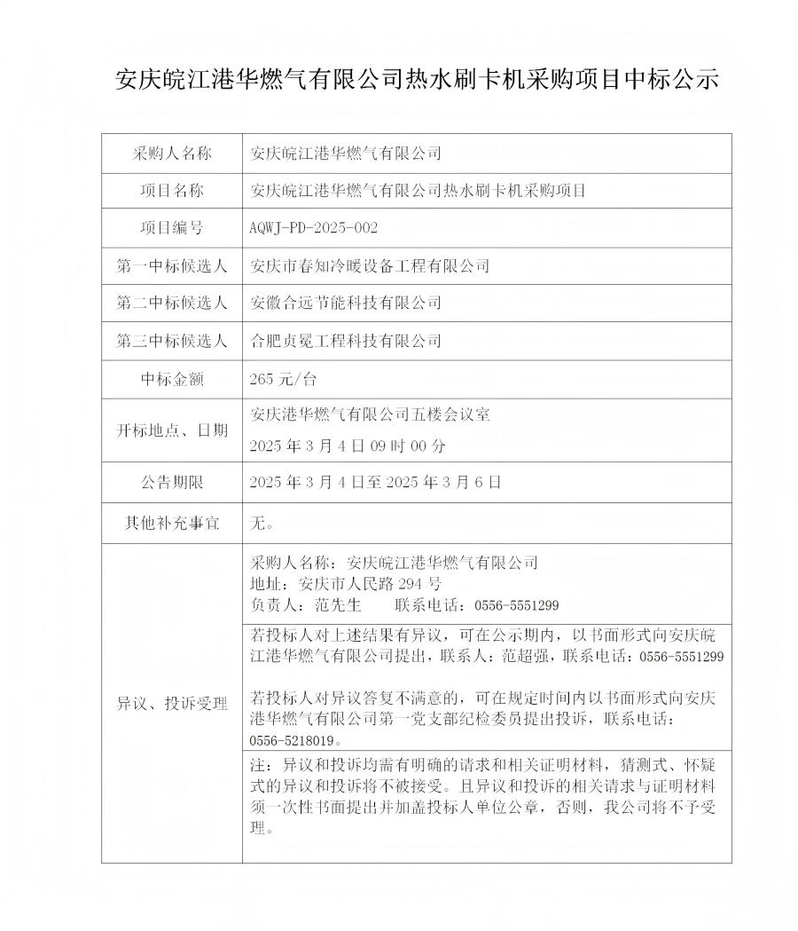 安慶皖江港華燃氣有限公司熱水刷卡機采購項目中標公示
