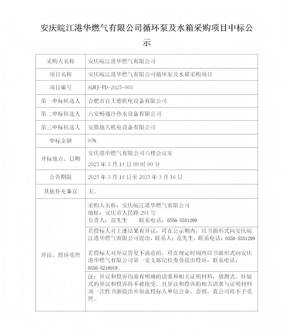 安慶皖江港華燃?xì)庥邢薰狙h(huán)泵及水箱采購(gòu)項(xiàng)目中標(biāo)公示
