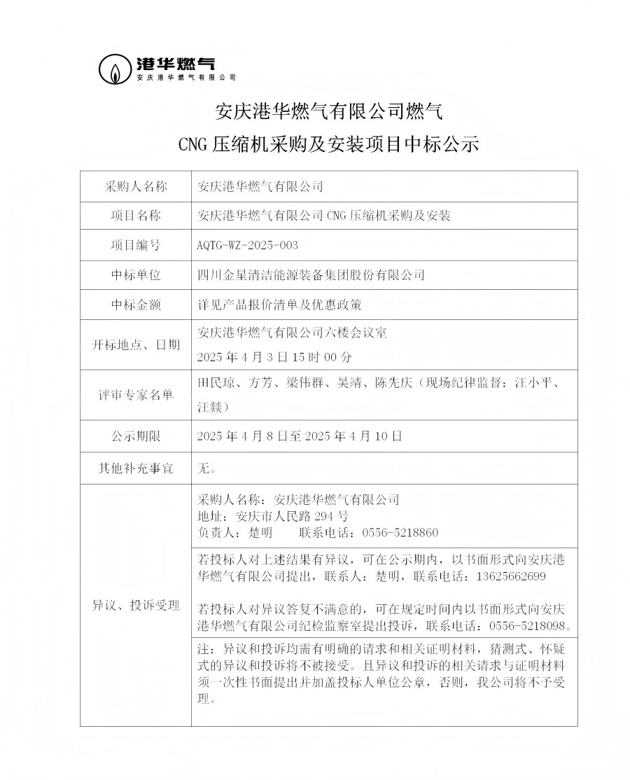 安慶港華燃?xì)庥邢薰救細(xì)釩NG壓縮機(jī)采購(gòu)及安裝項(xiàng)目中標(biāo)公示