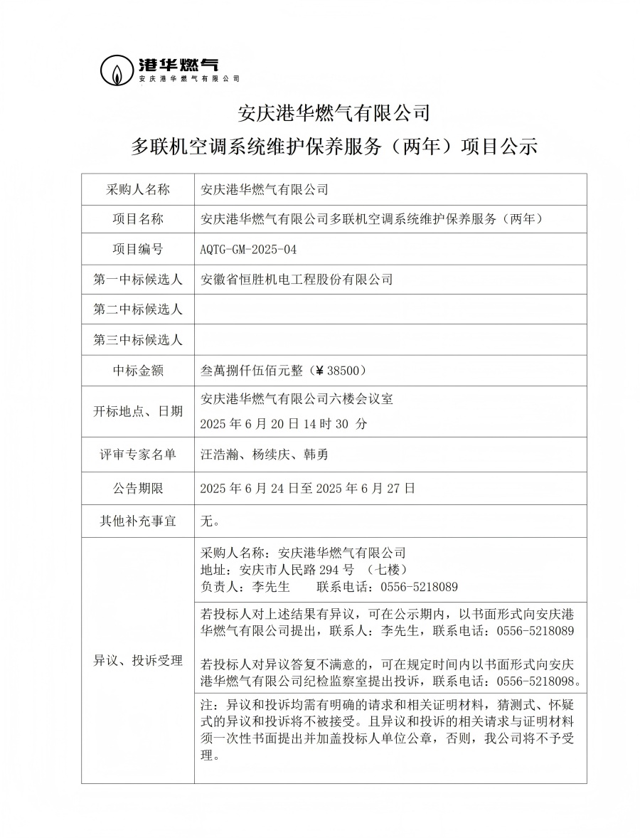 安慶港華燃氣有限公司多聯(lián)機空調系統(tǒng)維護保養(yǎng)服務(兩年)項目公示