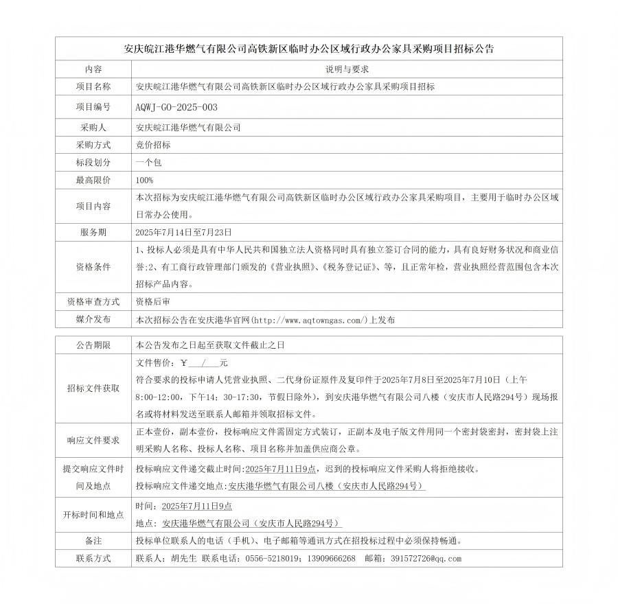 安慶皖江港華燃?xì)庥邢薰靖哞F新區(qū)臨時(shí)辦公區(qū)域行政辦公家具采購項(xiàng)目招標(biāo)公告 發(fā)布時(shí)間:2025-07-08    閱讀次數(shù):1708次