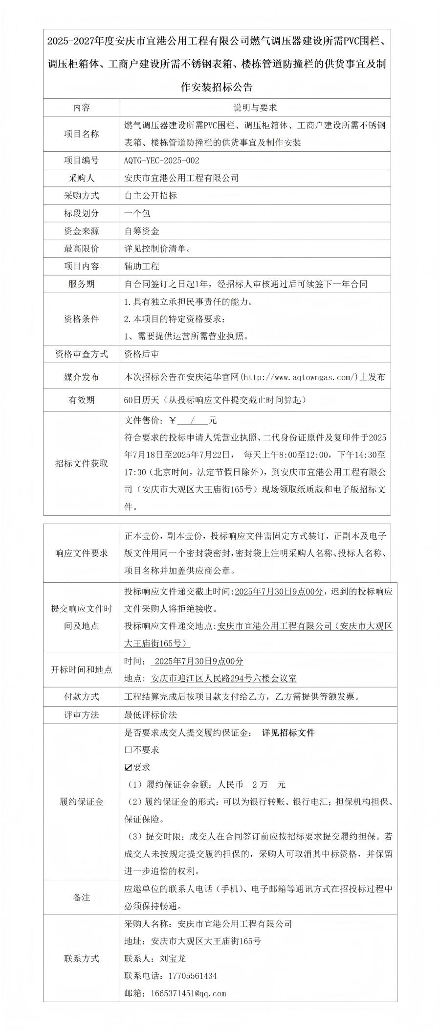 2025-2027年度安慶市宜港公用工程有限公司燃?xì)庹{(diào)壓器建設(shè)招標(biāo)公告 發(fā)布時(shí)間:2025-07-18    閱讀次數(shù):1493次