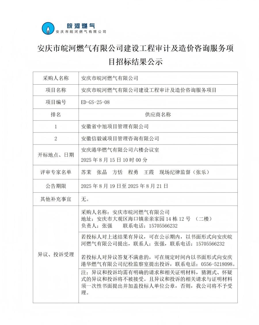 安慶市皖河燃氣有限公司建設(shè)工程審計及造價咨詢服務(wù)項目招標結(jié)果公示