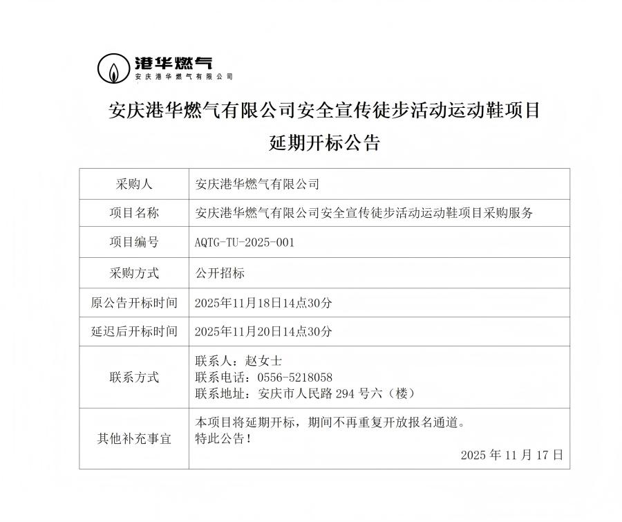 安慶港華燃?xì)庥邢薰景踩麄魍讲交顒?dòng)運(yùn)動(dòng)鞋項(xiàng)目延期開(kāi)標(biāo)公告