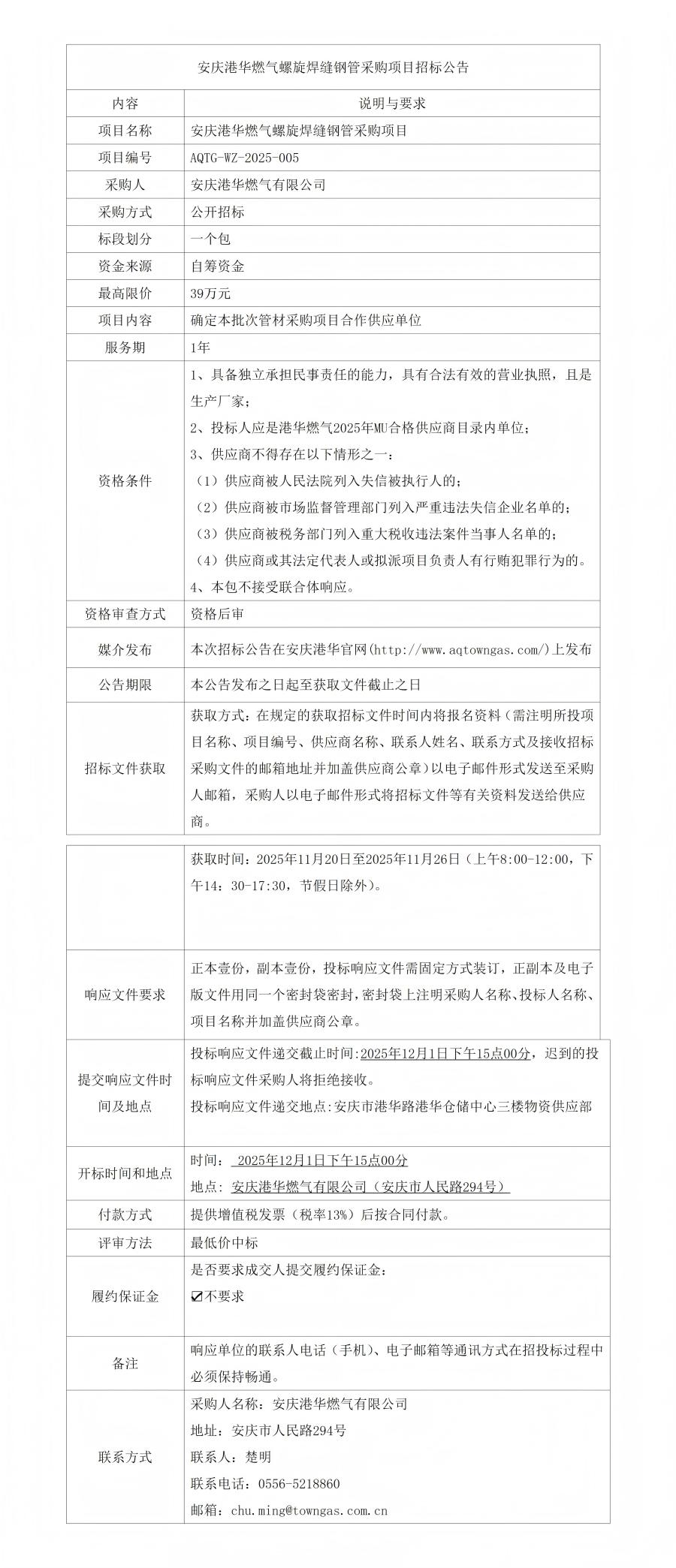 安慶港華燃?xì)饴菪缚p鋼管采購項目招標(biāo)公告