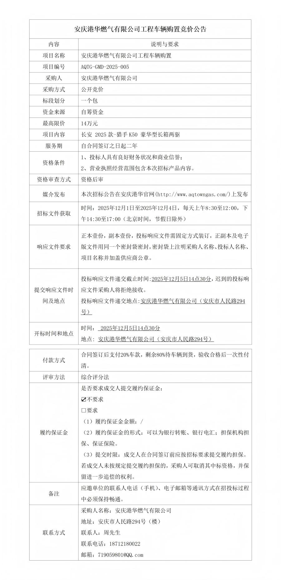 安慶港華燃?xì)庥邢薰竟こ誊囕v購(gòu)置競(jìng)價(jià)公告